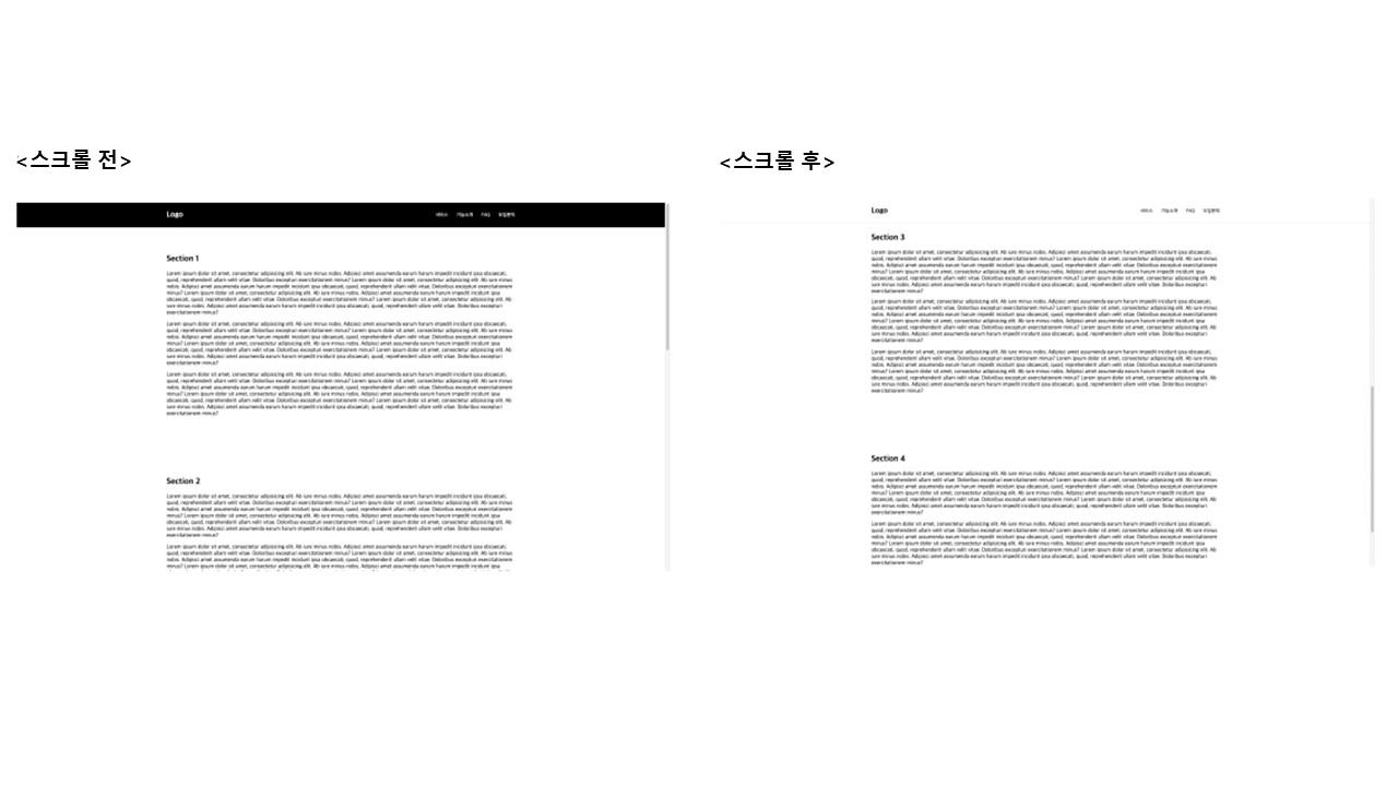 ๋ค์๊ณผ ๊ฐ์ ๋ฐฉ์๋ค์ ํตํด ์คํฌ๋กค ์์น์ ๋ฐ๋ผ ๊ฐ๊ธฐ ๋ค๋ฅธ Header ๋์์ธ์ด ๋๋๋ง๋๋๋ก ์ฝ๋๋ฅผ ๊ตฌํํ์๋ค.