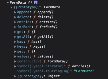 ํด๋น formData key์ value ์์ ๊ด๋ จ๋ ์ ๋ณด๋ฅผ ์ป๊ธฐ ์ํด์ ๋ค์๊ณผ ๊ฐ์ ๋ฐฉ๋ฒ์ ์ฌ์ฉํ ์ ์์๋ค.