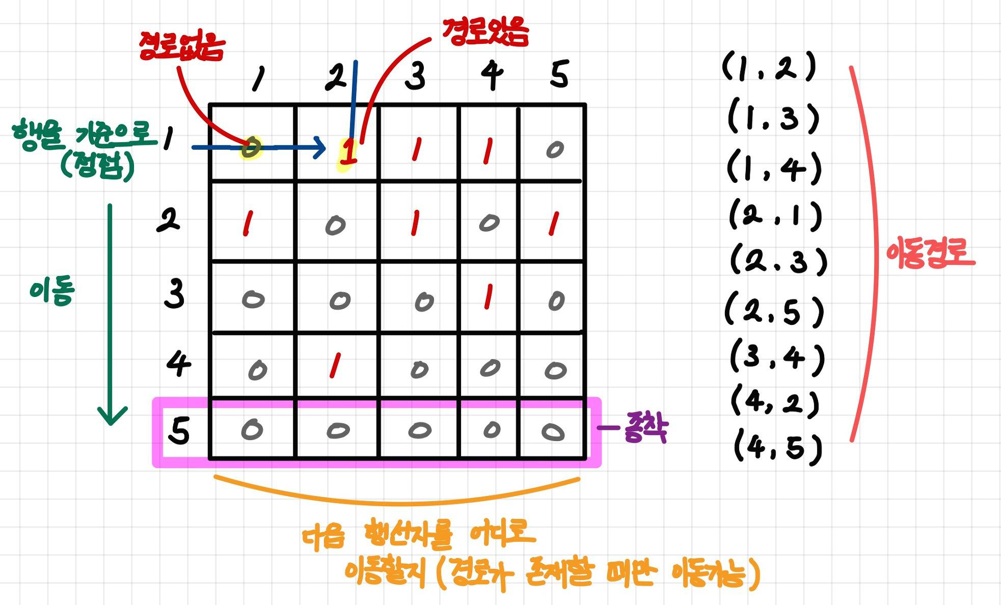 - arr[i][j]: ๋ ธ๋ i(ํ)์์ j(์ด)๋ก ๊ฐ๋ ๊ฐ์ ์ด ์์ผ๋ฉด 1, ์๋๋ฉด 0_๋จ๋ฐฉํฅ๊ทธ๋ํ์ ๊ฒฝ์ฐ