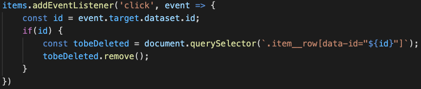 ์์ ๊ฐ์ด ๊ฐ๊ธฐ ๋ค๋ฅธ data-id๋ฅผ li ์์์ ์ ์ฉํด ์ค ๊ฒฐ๊ณผ, li์ ๋ถ๋ชจ ์์ ul ํ๊ทธ์ธ items์ ์ด๋ฒคํธ ํธ๋ค๋ฌ๋ฅผ ๋ฑ๋กํ์ฌ ์ด๋ฒคํธ ์์์ ํตํด ์ค์ ํด๋ฆญ ์ด๋ฒคํธ๊ฐ ๋ฐ์ ํ event.target์ id ๊ฐ์ ์ด์ฉํ์ฌ ์๋ณํ ์ ์์๋ค.