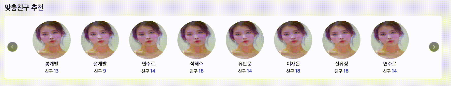 ํ์ฌ ํ๋ก์ ํธ์์ ์น๊ตฌ ๋ฆฌ์คํธ๋ฅผ ๋ณด์ฌ์ฃผ๋ ๊ธฐ๋ฅ ๋์์ด ์ํํ๊ฒ ๋๊ธฐ ์ํด์ Swiper ๋ผ์ด๋ธ๋ฌ๋ฆฌ๊ฐ ์ ๊ณตํ๋ Swiper Component๋ฅผ ๊ทธ๋๋ก ์ฌ์ฉํ๋ฉด ์๋๋ค.