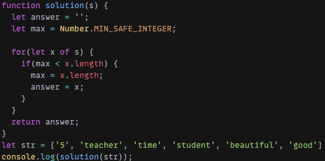 ์ฒ์์ ๊ฐ์ฅ ๊ธด ๋ฌธ์๋ฅผ ํด๋น ๋ฌธ์์ด์์ ๊ตฌํ๊ธฐ ์ํด max ๋ณ์๋ฅผ Number.MIN_SAFE_INTEGER์ ํตํด ๊ตฌํ ์ ์๋ ๊ฐ์ฅ ์ต์๊ฐ๊ณผ ๋น๊ต