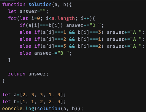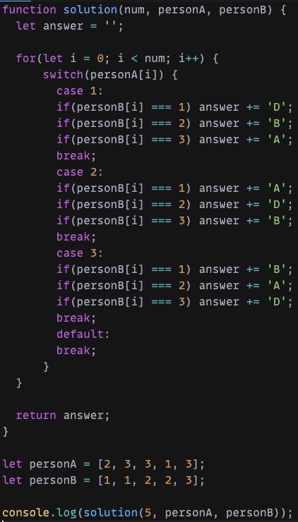 ๊ธฐ์ค์ A(personA)์๊ฒ ๋ง์ถ์ด์ switch ์กฐ๊ฑด๋ฌธ์ ์ฌ์ฉํ๋ค. ํฌ๊ฒ 3๊ฐ์ง์ ๊ฒฝ์ฐ๋ก case๋ฌธ์ ๋๋ ์ ๊ฐ ๊ฐ์ ๋ฐ์ ๋ณด ์ํฉ ์์์ ๋์ฌ ์ ์๋ ๊ฒฝ์ฐ๋ฅผ ๋ค์ if ์กฐ๊ฑด๋ฌธ์ ์ฌ์ฉํ์ฌ ์ด์ ๋ง๋ ๊ฒฐ๊ณผ๊ฐ์ answer ๋ณ์์ ์ ์ฌํด ์ฃผ์๋ค.