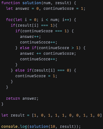๋ง์ฝ continueScore๊ฐ ๊ฐ์ฐ ๋ ์ํ์์ ๊ทธ ๋ค์ ์ฑ์ ๊ฒฐ๊ณผ๊ฐ 1์ผ ๊ฒฝ์ฐ์๋ ์ค์ฒฉ if๋ฌธ ๋ด์์ ์กฐ๊ฑด์์ ์ฑ๋ฆฝํ์ฌ answer์ ์ง์ ๊ฐ์ฐํด ์ฃผ๋ ๊ฒ์ด ์๋๋ผ ๋งํ ๋ฌธ์ ๋งํผ ์ค์ฒฉ ๋์๋ continueScore์ ๊ฐ์ ํฉ์ฐํด ์ฃผ์๋ค.