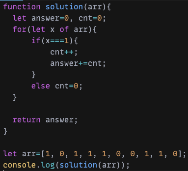 ์ด๋ฅผ ํด๊ฒฐํ๊ธฐ ์ํด ๋ฌธ์ ๋ฅผ ๋ง์ถ ๊ฒฝ์ฐ answer๋ฅผ ์ง์ ๊ฐ์ฐํด์ฃผ๋ ๋ฐฉ์์ด ์๋, ์ฒ์๋ถํฐ cnt(continueScore) ๋ณ์๋ฅผ 0์ผ๋ก ์ด๊ธฐํ ํด์ค ๋ค ์ด ๊ฐ์ answer์ ํฉ์ฐํด์ฃผ๋ ๋ฐฉ์์ด ์ฝ๋ ์ ๋ ๊น๋ํ๊ณ ํจ์จ์ ์ด๋ค.