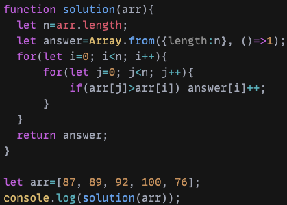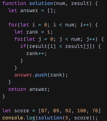 ์ด๋ฅผ ์ํด ์ด์ค for๋ฌธ์ ์ด์ฉํ์ฌ ๋ฑ์๋ฅผ ์๊ณ ์ ํ๋ ํ์(result[i])๊ณผ ๋น๊ต๋๋ ํ์๋ค(result[j]) ์ค์ ํ์์ ์ ์๊ฐ ๋ ๋์ ๊ฒฝ์ฐ์ 1๋ก ์ด๊ธฐํ ํด์ค rank๋ณ์๋ฅผ ๊ฐ์ฐํด์ฃผ๋๋ก ์ฝ๋๋ฅผ ์์ฑํ์๋ค.