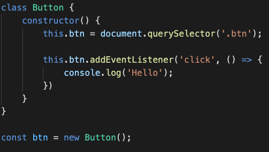 ๋ชจ๋ํ๋ฅผ ์ํด ๋ค์๊ณผ ๊ฐ์ด button ํ๊ทธ์ ํด๋์ค ์ดํธ๋ฆฌ๋ทฐํธ์ธ btn์ ๋ ธ๋ ์์ฑ๊ณผ ์ด๋ฒคํธ ๋ฆฌ์ค๋ ๋ฑ๋ก์ Button ํด๋์ค ๋ด์ ์์ฑ์์