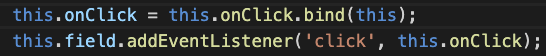 ํ์ง๋ง OnClick ๋ฉ์๋ ๋ด์์์ this๋ Field ํด๋์ค์ ์ธ์คํด์ค๋ฅผ ์ฐธ์กฐํ์ง ๋ชปํ๊ณ undefined๋ฅผ ๋ฐ์ธ๋ฉ๋๋ ๋ฌธ์ ๊ฐ ๋ฐ์ํ์๋ค.