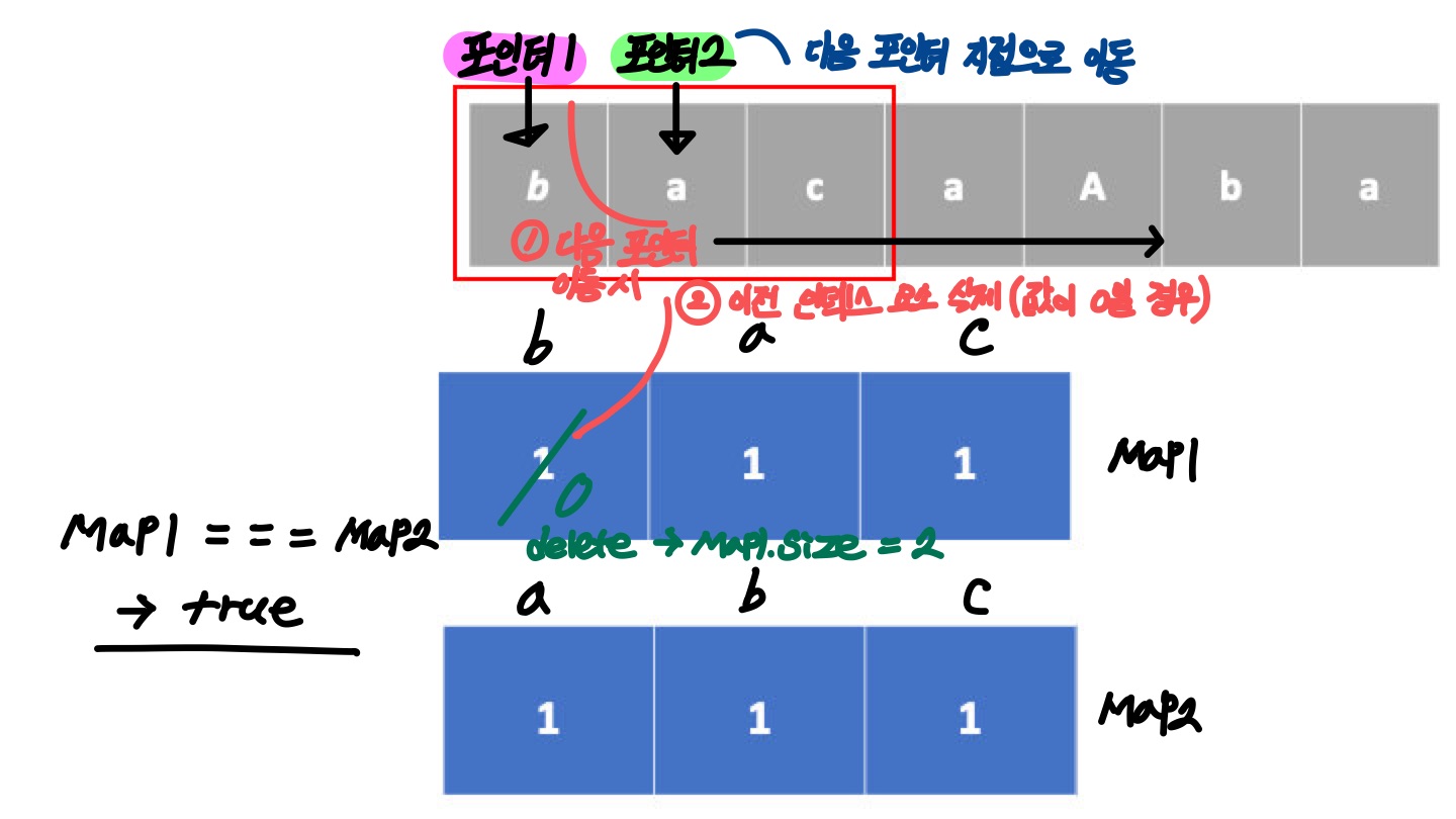 - ๋น๊ต๊ฐ ๋๋ ๋ค์ ํฌ์ธํฐ1์ด ๊ฐ๋ฆฌํค๊ณ ์๋ ์ธ๋ฑ์ค ์์๋ฅผ Map1 ๊ฐ์ฒด์์ ์ญ์ ํ๋ค.