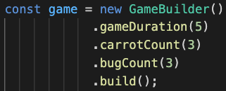Game ํด๋์ค๋ฅผ ํตํด ๋ฐ๋ก ์ธ์คํด์ค๋ฅผ ์์ฑํด ์ฃผ๋ ๊ฒ์ด ์๋ ์ด์ ์ ์์์ GameBuilder ๋ผ๋ ํด๋์ค๋ฅผ ๋ง๋ค์ด ํด๋์ค ๋ด์ ๋ฉ์๋๋ฅผ