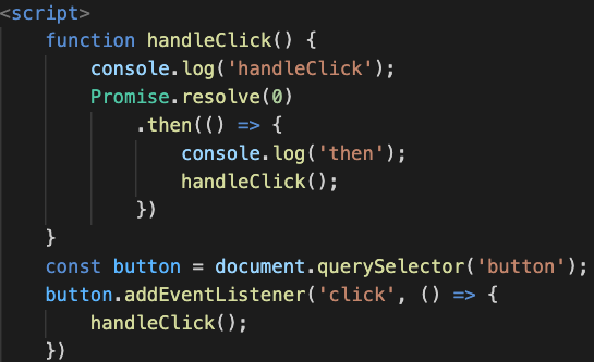 ๋ฐ๋ฉด์, Microtask ํ์ ๊ฐ์ ๊ฒฝ์ฐ๋ ์ด๋ฒคํธ ๋ฃจํ๊ฐ ์์ ์ ์ ์ฅ์ ๋ด์ ์ฝ๋ฐฑ ํจ์๋ค์ด ๋ชจ๋ ๋ค ์์ด์ง ๋๊น์ง ๊ธฐ๋ค๋ฆด ๋ฟ๋ง ์๋๋ผ ์ฝ๋ฐฑ ํจ์๊ฐ ๋ชจ๋ pop ๋์ด ์ข ๋ฃ๋๊ธฐ ์ ์ ์๋ก์ด ์ฝ๋ฐฑ ํจ์๊ฐ Microtask ํ์ ์๋กญ๊ฒ ์ ์ฌ ๋ ์ฝ๋ฐฑ ํจ์๊ฐ ์กด์ฌํ๋ค๋ฉด ์ด๋ฅผ ๊ณ์ ์ฝ ์คํ์ ์ ์ฌํ๋ค. ์ฆ, Promise then์์๋ ์ด๋ฒคํธ ๋ฃจํ๊ฐ ์ ์์ ์ผ๋ก ์ํ ์ฐธ์กฐํ์ง ๋ชปํ ์ฑ ๊ณ์ Microtask ํ์ ๋จธ๋ฌผ๊ฒ ๋์ด ๋๋๋ง ์ํ์ค๋ฅผ ์ฐธ์กฐํ ๊ธฐํ๊ฐ ์๊ธฐ์ง ์์ ๋ธ๋ผ์ฐ์ ๋ฅผ ์ ๋ฐ์ดํธ ํ์ง ๋ชปํ ์ฑ ์์๊ฐ์ด ๋ณํ์ง ์์ ๊ฒ์ด๋ค.